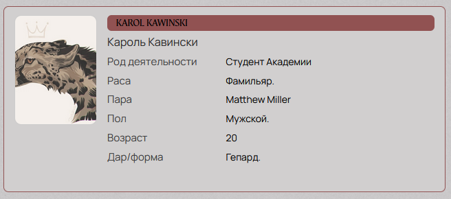 Elias Flynn, будет) с поправкой на то, что у фамильяра в облике зверя всё равно будет лучше с тем, в чём он силён.