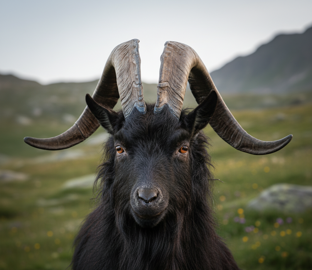 Крупный чёрный козёл с редкими вкраплениями белого. Невозможно с уверенностью отнести его к какой-либо породе, однако в его облике угадываются черты bündner strahlenziege и диких альпийских козлов, вроде capra ibex. Качество шерсти близко к кашемиру. Копыта горных козлов имеют строение, подходящее для экстремальных горных переходов.